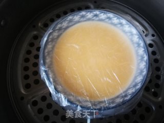 凉水上锅,用保鲜膜覆上。(家没保鲜膜了,我用保鲜袋覆上了,蒸到9分钟时一下子贴到蛋面上,我拿掉了????)中小火蒸二十五分钟。蒸到后来,隔两三分钟开一下盖儿再盖上,蛋羹不鼓泡。