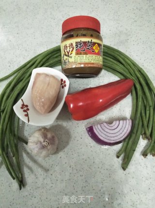 芝麻酱2勺,豇豆300克,鸡胸肉150克,红尖椒1个,洋葱1块,大蒜1头。