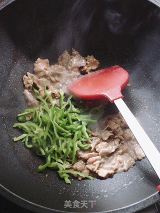 炒至牛肉变色时加入黑胡椒粉炒匀,加入青椒,鸡精和1/2匙盐,翻炒均匀即可