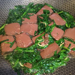 把焯熟的鸭血放入,轻轻翻动,加入适量盐及鸡精调味即可。