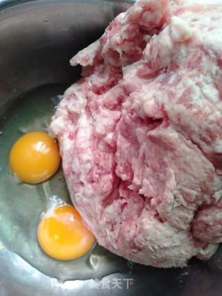 肥瘦相间的猪肉剁成肉馅,加葱姜蒜末打入两个鸡蛋用手把它抓均匀。。