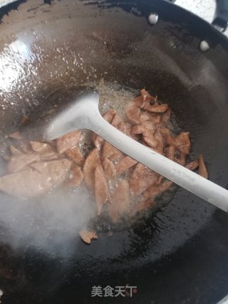 锅里倒油,油热倒入腌制好的猪肝爆炒一下捞出来