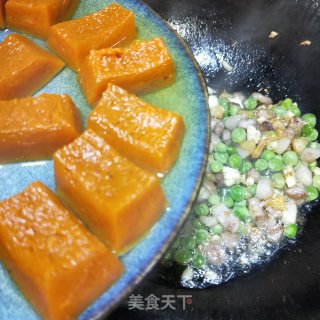 准备材料:南瓜、五花肉、青豆、虾仁。