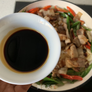 五花肉切薄片、蒜切片、辣椒斜切,大蒜叶根部拍一下再切段。