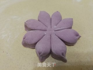 白色面团上抹水,紫薯花摆上。