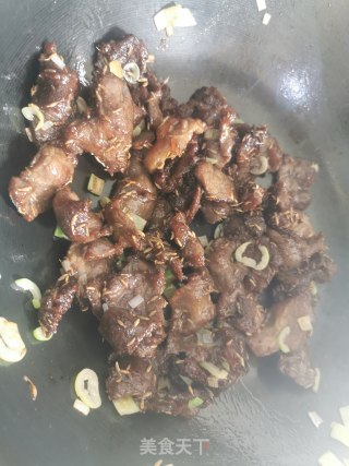 牛肉切片。先抓进去2小勺盐,再加1小勺胡椒粉、2勺料酒、2勺生抽、一丁点儿老抽。抓匀后加一点儿淀粉抓匀锁住水分,再加食用油抓匀防止肉片之间互粘。