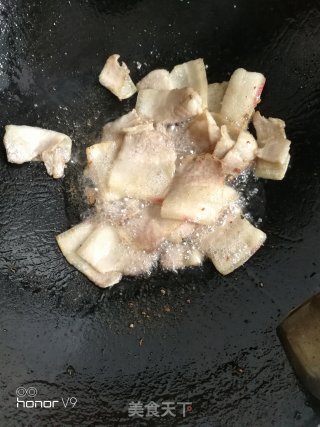 然后加入蒜苗头。再加入肉。加老抽加盐翻炒。
