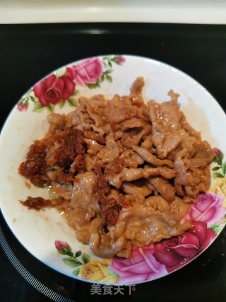 肉切片后放少许盐、酱油或生抽、撇去清水的淀粉糊抓匀后放1大勺油再抓匀腌10多分钟,目的是入锅炒的时候肉片不会粘在一起。