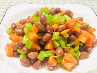 将红萝卜丁和芹菜丁焯水至断生,然后将三种食材放进碗里,加盐、味精、芝麻油拌匀即可上桌。