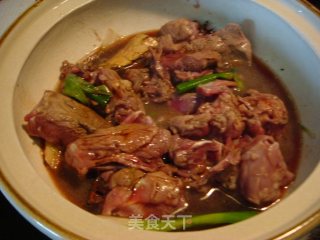 把腌制好的鸭胸肉放到爆香的砂锅里。