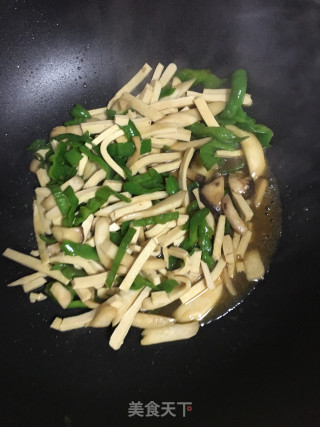 锅中放入适量油烧热后放入青椒、杏鲍菇、和白干煸炒。