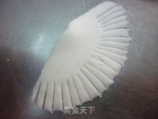 再用一块块面团搓成粗一点的条压扁,做出翅膀的羽毛,用刀压出羽毛的纹路。