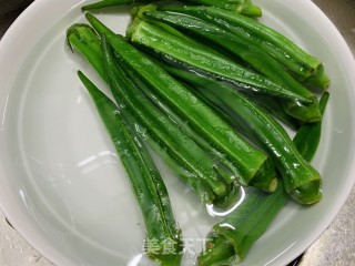 秋葵洗净,不要切。下锅煮沸3-5分钟后捞起过冷水。图中用流水冲3分钟冷却,如有冰水口感更佳。
