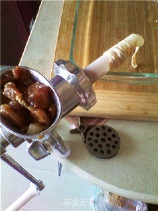 把拌好的肉放进绞肉机里,肠衣套在套筒扣上。开始灌肠啦。一会就灌完啦。