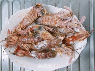 皮皮虾放入盘中,少许盐、姜片、料酒腌制去腥味。