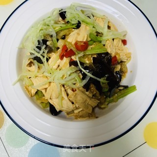 先放腐竹木耳在盘子里,抓点芹菜(我分成两份来做凉拌,一份不辣的给孩子吃,一份辣的给大人吃)和黄瓜丝,抓均匀。