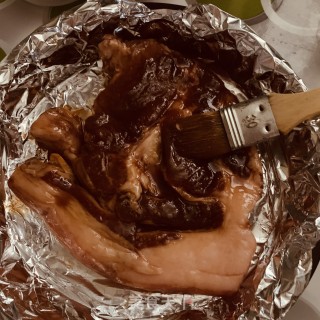 翻面,把剩下的腌肉的酱汁再倒进去刷均匀,迅速刷一层蜂蜜,放进烤箱继续烤。