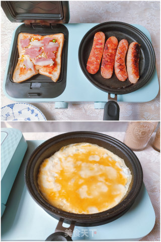 花样早餐:三明治披萨、奶茶、煎鸡蛋卷、煎香肠的做法步骤
