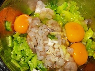 二瓜切片用盐腌10分钟,挤出水分,加入虾仁。