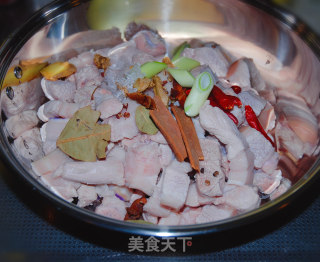放入冰糖20g,加入饮用水800ml,水量刚没过肉就好。