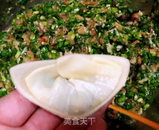 放入韭菜同时放入油和香油搅拌均匀再放盐和味精拌匀入味这样韭菜不易下汤比较好包。