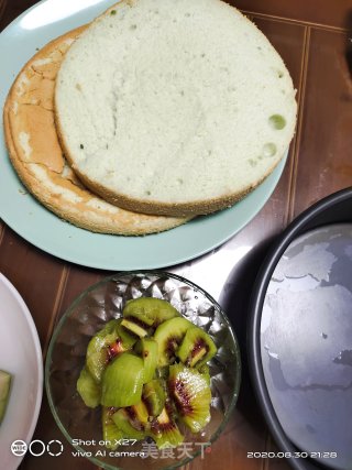 猕猴桃去皮切块,蝶豆花戚风蛋糕切片备用。