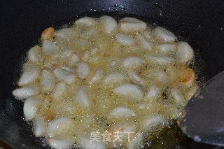 大蒜入油锅,煎炒至出香味,微黄,捞起。