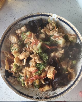 加入鸡蛋,黑木耳,西兰花,加适量清水,翻炒一下就可以出锅了。