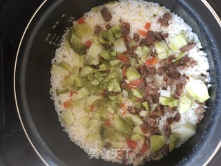 米里加入水后,放入胡萝卜丁和香肠丁。