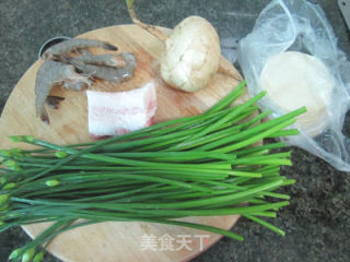 韭菜苔摘除尾部老硬段并洗净切粒,五花肉切细粒,虾去肠泥切粒。各种食材处理好后加入少量味精、盐、麻油、白胡椒粉。