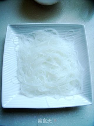 找一稍大的平盘,底部先铺上泡软沥干水份的粉丝用量为2/3。