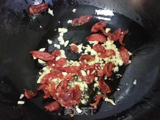 腊肠切片备用,儿菜切成稍厚一点的片。