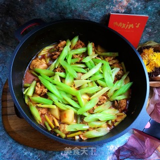 马克西姆不粘锅预热倒入油烧热,放入鸡块煸炒。