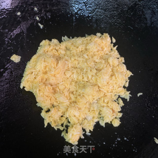 热锅下油放入米饭炒至粒粒分明。