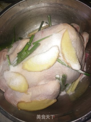 将葱段、姜片丢在鸡身上撒入食盐,用手将食盐抹在鸡身的每一处(包括腹腔之内)。