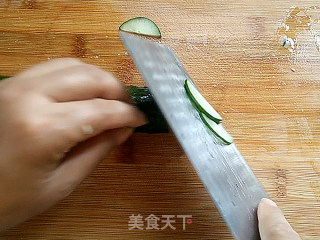 黄瓜先纵向剖开,可以一半小些一半大些,用刨皮刀在大的一半黄瓜切面刨出厚约1毫米的长条黄瓜片。