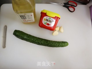 准备主要食材:黄瓜一根,大蒜三粒,辣椒酱,米醋。
