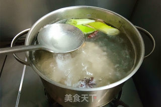 猪腱子冷水下锅,放入葱段、姜片、香叶、八角、料酒去腥增香。