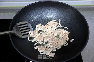 凉锅凉油,肉丝入锅,中火加热,用铲子迅速将肉丝划散。
