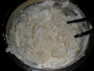 将酵母水缓缓倒入面粉盆中,边倒边搅拌。