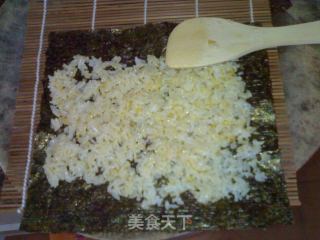 饭煮熟后,加少许酱油调味,放上竹帘,做成寿司