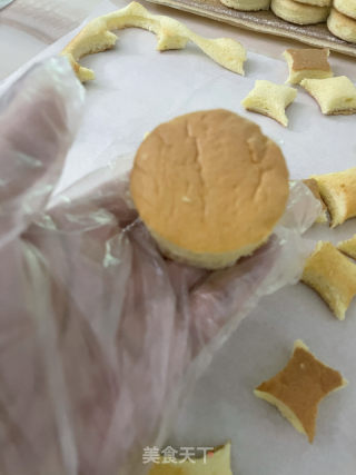 晾凉的戚风蛋糕,倒扣,脱掉油纸,然后用5cm的慕斯圈,圈出蛋糕胚。如果没有慕斯圈,用杯口或者圆形饼干模也可以。也可以把蛋糕糊装入裱花袋,剪个圆形小口,然后挤在烤盘再烤。不过这种方法烤出来的蛋糕胚,有可能不是特别圆,但是自己家吃,就可以不用介意。