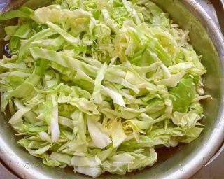 包菜用盐水浸泡5分钟,再用水冲洗干净沥干水分备用。