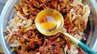 萝卜干用偏热的温水清洗4-5遍。注意水温要偏热。