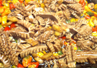 洗锅重新热油,放黄椒、红椒加盐炒至八成熟。