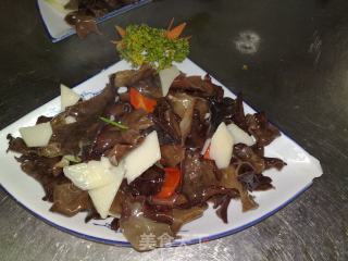 热锅烧油,放入淮山、木耳翻炒,调味(一定要勾芡),出锅