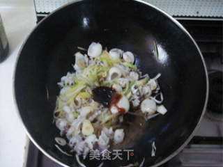 锅中烧水,水开后放入洗好的墨斗鱼,焯水,略微一缩,赶紧捞出来。时间不能长,以免变老。