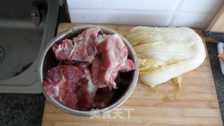 大梁骨冲洗干净,酸菜扒开里面的芯冲洗干净,粉丝也冲洗干净。