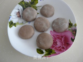 把豆沙馅包进皮里。收口朝下,团成圆形,再压扁。凉糕做好了。