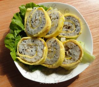 把鸡蛋饼和揣好的糯米饭摊在寿司帘上,再把炒好的鱼茸在米饭的边缘排成一条。